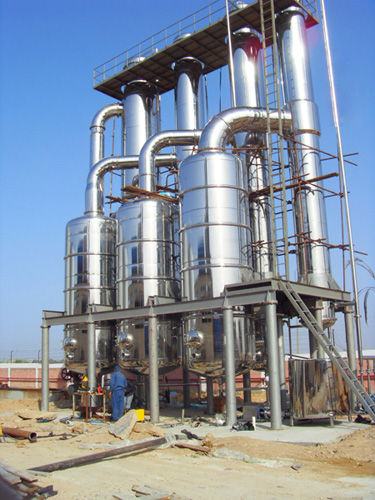 各效蒸發(fā)器、各效分離器、冷凝器、熱壓泵、真空及排水系統(tǒng)、各效料液輸送泵、操作平臺、電器儀表控制柜及閥門、管路等系統(tǒng)組成。
